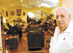 Retired teacher believes he has world’s oldest playable recording BY LAUREN MATTHEW A room full of old-fashioned phonograph horns, arranged in neat rows, fan toward the door of Aaron Cramer’s display room. A 1941 Wurlitzer jukebox along the back wall sports a Technicolor peacock design. Talking dolls sit in a glass-front display cabinet along the left wall. All around the room are placards advertising phonographs and music boxes. There are multiple movie posters for “Edison, the Man,” starring Spencer Tracy. For Cramer, the room represents a 35-year love affair with its many treasures. “I’m interested in the technology,” said Cramer, who moved to Old Bridge three years ago. “These devices still work after over 100 years. But you have to throw out your electric toothbrush after a few months.” Cramer, a longtime Brooklyn resident and a retired high school technology teacher, discusses his collection proudly. Everything he has, he noted, works. “I spend a lot of time with these things,” Cramer said. At the immediate entrance to the room of collectibles, Cramer has one of the earliest jukeboxes, dating from 1900. He dropped a nickel into the slot at the front of the rectangular wooden box and it began to play. It’s an Edison Automatic Concert Phonograph, according to its label. The recording it plays is crackling, but the tune is still there and clear. Cramer pointed out that a device like this would’ve been in a store, where patrons would put nickels in when passing by. Cramer also owns a phonograph with a headphone attachment, akin to the listening stations in today’s music stores. This, he said, would have been with many other machines like it, along a wall in an arcade. People would come in with tissues and wipe off the ear pieces before using them. The headphones, Cramer said, were the key. Someone could listen to their own piece of music without disrupting the arcade patron next to them. “You’d go crazy listening to 20 of these at once,” he noted, gesturing to the machine. Progressing around the room, Cramer pointed out a coin-operated metal disc music box that dispenses gum, as well as two tiny phonograph toys. The toys, he said, were made by a chocolate company and used to hold chocolate records. Not surprisingly, the candy records have not survived. There’s one item in this room, however, that Cramer’s collection is best known for. Set up on a shelf, a tape recorder next to it, with a sign alerting observers of its importance, is the Lambert Phonograph. Made in 1878, Cramer said it is the world’s oldest talking clock. According to the “Guinness Book of World Records” and the “Encyclopedia of Recorded Sound in the United States”, the phonograph plays the world’s oldest “playable” recording. There may be older examples, Cramer said, but because many early recordings were done on soft materials such as tin foil, a popular recording medium at the time the Lambert machine was made, they cannot be heard today. Frank Lambert, the phonograph’s namesake, created the machine and the recording on it because of a contract between the Ansonia Clock Co. and Thomas Edison. The contract, dated Jan. 7, 1878, discussed the making of a record to be placed inside a talking clock. To make the record, Lambert first had to make the phonograph. Letters from the clock company to Edison verify the age of the phonograph and the recording. “There’s also information on what Edison wrote. There are copies of that contract in West Orange,” Cramer noted. The recording cylinder, Cramer said, is the reason that the recording can still be played. It’s lead instead of tinfoil. “The metal sleeve comes out,” Cramer said, taking the phonograph apart, “and it would’ve been used as a mold for the record.” Listening to Lambert’s recording, words are difficult to make out. But Lambert can be heard, clearly, in parts. He’s calling out hours for the talking clock. Although Guinness stopped listing the category that the phonograph fits into after 1994, the recording is still the oldest in the world, according to Cramer. He said researching the machines has become an enjoyable part of collecting. After Guinness contacted him about the Lambert recording and verified its age, Cramer and his wife, Thea, looked into Lambert’s past. “My wife actually tracked down his granddaughter — the last living person he spoke to,” Cramer said. The Cramers were then able to trade information with the granddaughter. “It was like a treasure hunt,” Cramer said, smiling. A machine near the back of the room is Cramer’s favorite. Twelve sets of 100-year-old headphones attached to rubber tubing snake out the top of it. This was something that could be found at a carnival, Cramer said. “They’d charge 5 cents for each person to listen,” he said, adding that different music choices were available on cylinders inside drawers underneath the headphones. In 1892, that machine, called an Edison North American, cost $200. “You could buy a row house in Philadelphia for that [at the time],” Cramer said. Instead, the man who owned the machine made a living from it, taking it to various venues and charging people to listen to the various pieces of music. The reason Cramer favors the North American has less to do with what it does and more to do with something its first owner left behind. “There’s a home recording,” Cramer said, “that was made by the great-great grandfather of the guy I bought it from.” The recording was made in 1893, and in it, the man talks about his farm in Maine. His son is also on the recording. “He says he’s talking into this great invention so that his children in the future can hear [him],” Cramer said. The family he bought the machine from never heard that recording. Cramer transcribed it and fixed it digitally, and sent the recording to them. “I sent them a copy of their ancestor’s voice,” Cramer said, his smile return
