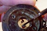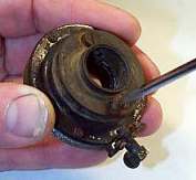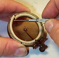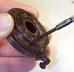 Next, remove the very tiny screw that holds the diaphragm to the needle bar. This will usually be covered with a small bit of wax, so it usually helps to scrape the wax out of the screw head first. Be careful with this screw! It is very tiny and very easily lost! |