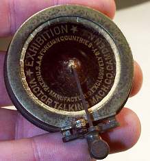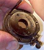 The original reproducer is tarnished, so some cosmetic cleaning is needed. But more importantly, the real reason for the rebuild is that the rubber gasket materials have dried out, and no longer allow the diaphragm to vibrate freely in the housing. The mica diaphragm itself may also be "fatigued", so I generally replace that as well. And most often on the Exhibition, the back rubber flange, which attaches the reproducer to the tone arm, has dried out and can no longer provide the air-tight fit necessary for maximum reproduction |