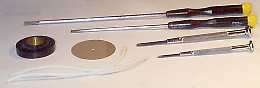 The first step is to gather together the proper tools and parts needed for the rebuild. For the Exhibition, we need two lengths of gasket rubber (these are hollow tubes of flexible rubber), a mica diaphragm of appropriate size, a replacement back rubber flange (if needed), a small bit of bees wax, a soldering iron (don't worry...no real soldering here...it's just to melt the wax!). You should also have a good set of jewelers screwdrivers in varying sizes. This is very important, as the functional and cosmetic integrity of the screws are maintained by using the proper size screndriver. |